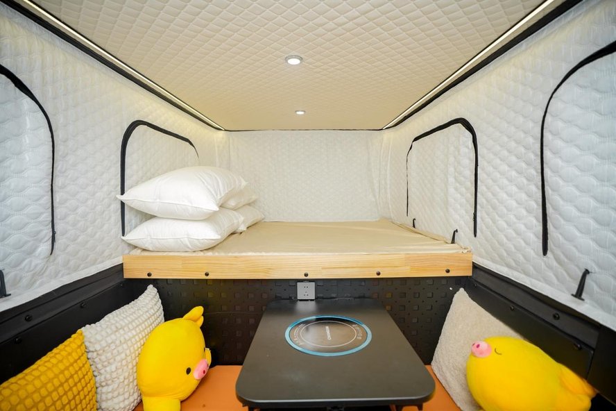 2.2米,地库正常进出,日常代步通勤无障碍,不会因为买了旅居车就把城市出行搞砸。到了营地,房箱升起,立刻变成2000×1700mm折叠式大床,正常成年人翻身不用侧身