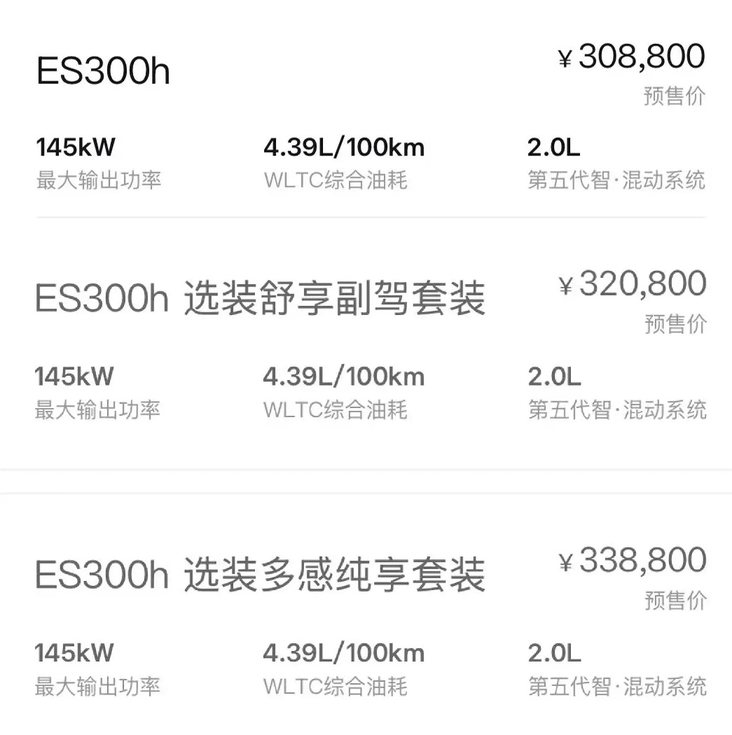 大家好,我是大李。日前,雷克萨斯官方终于把全新ES300h的预售价甩出来了,30.88万元起。说实话,这价格对比上一代ES300h来说,一口气直接降了7万多(上一代起步得要37.99万),但当我仔细翻了翻配置表和参数后,那点儿惊喜感瞬间被稀释了不少,感觉雷子还是那个雷子。