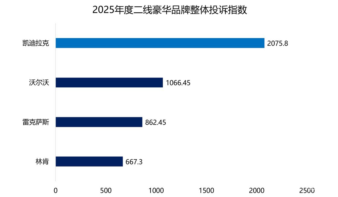 汽车门网数据显示:2025年凯迪拉克投诉指数达到了2075.8,同比增长了46%。紧随其后的是沃尔沃,投诉指数达到了1066.45,同比大涨了119%。雷克萨斯和林肯的投诉指数涨幅均不超25%。
