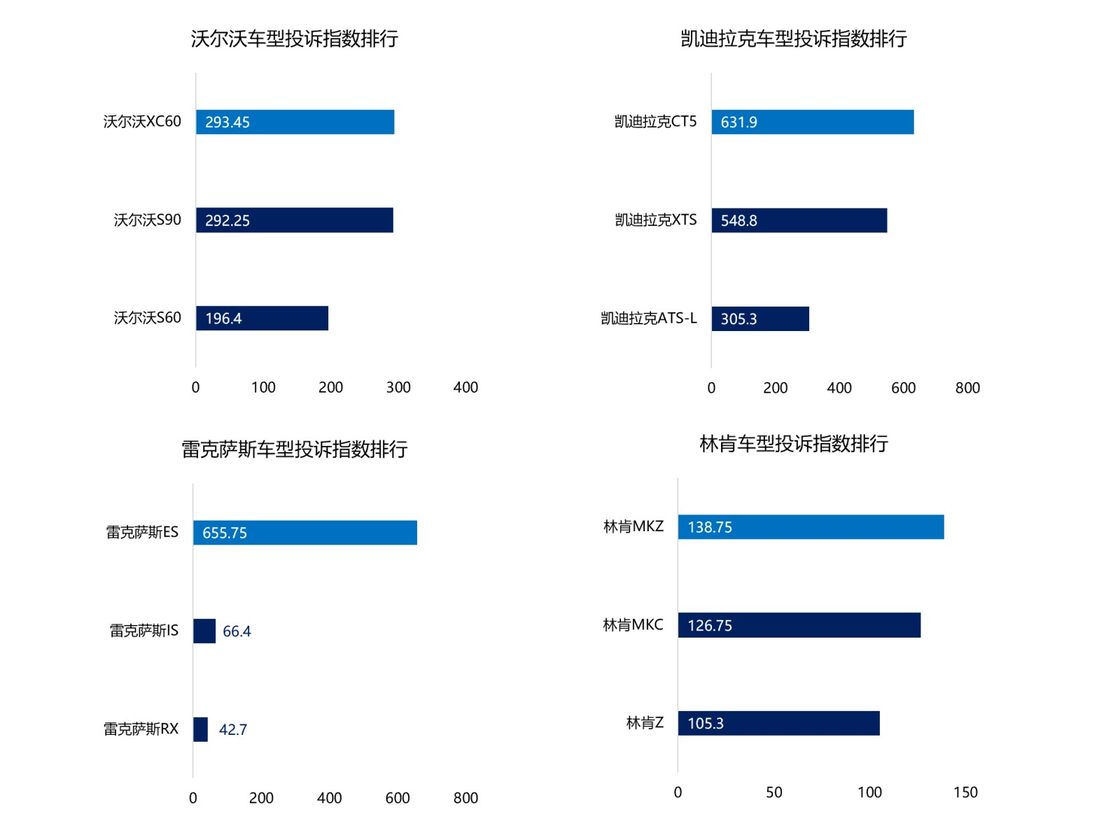 综合投诉数据来看,凯迪拉克投诉基数较高,沃尔沃投诉基数偏小但增速显著,雷克萨斯和林肯投诉指数涨幅整体处于可控区间。