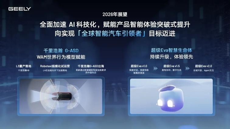 例如,2025年吉利率先发布行业首个全域AI技术体系,2026年将完成2.0版本迭代并首发WAM世界行为模型,构建起统一的“整车大脑”,推动汽车从“AI堆砌上车”到“AI智能汽车”的革命性转变。智能驾驶领域,千里浩瀚G-ASD已跻身全球第一梯队,对标特斯拉FSD,2026年G-ASD 4.0将与极氪8X全球首发,H7版本则大规模应用于领克、银河车型,实现“智驾平权”;更重要的是,该系统已获得联合国欧盟UN R171国际认证,2026年将实现出海规模化应用,成为中国智驾技术出海的核心名片。