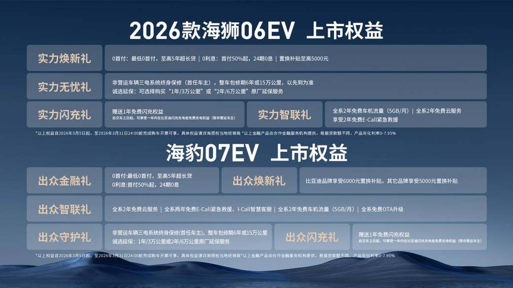为了让用户尽早体验闪充技术带来的出行变革,两款新车同步推出重磅上市权益:金融方面提供最低0首付、至高5年超长贷,首付50%起享24期0息;置换补贴最高可达6000元(比亚迪品牌);非营运车辆三电系统终身保修(首任车主),整车包修期6年或15万公里;赠送1年免费闪充权益,全系2年免费车机流量(5GB/月)与云服务。权益有效期即日起至2026年3月31日24:00,完成购车开票即可享受。