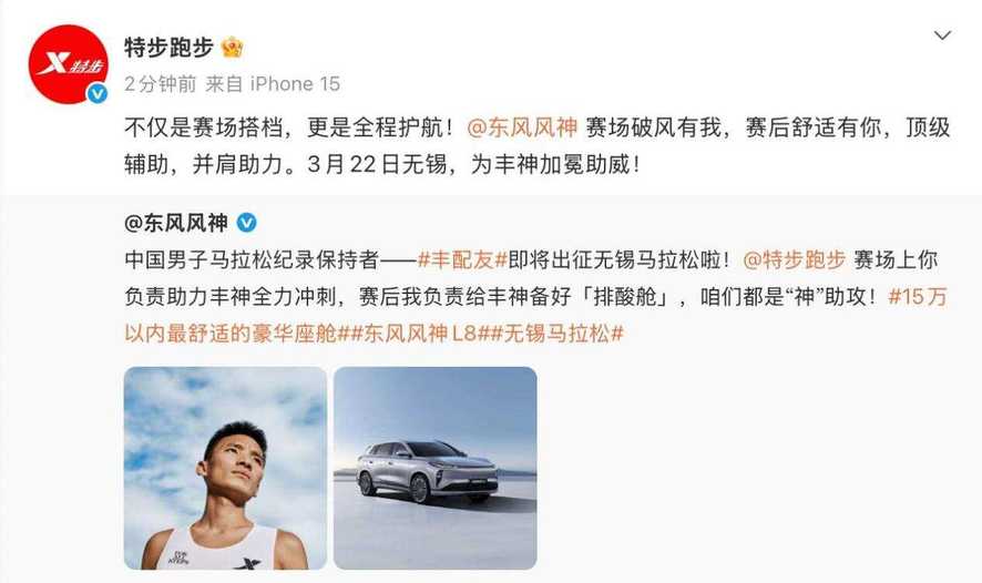 从东京赛道到无锡赛场,从“丰神”到“风神”,从特步的专业陪伴与重金嘉奖,到东风风神的舒适守护,这场双向奔赴不仅是马拉松“国家队”与中国品牌“国家队”的相遇,更是一次关于“格局”与“担当”的相互映照。正如丰配友在赛道上选择为团队护航,东风风神也始终秉持“为全球家庭造好车”的品牌初心,以舒适座舱护航每一次全力以赴;特步则坚守“国人竞速 全民畅跑”战略,以专业装备与激励计划,助力中国跑者不断突破;而丰配友则用赛场上的突破,印证着“长距离不妥协”的共同信念,也诠释着国产力量强强联合、相互成就的美好愿景。