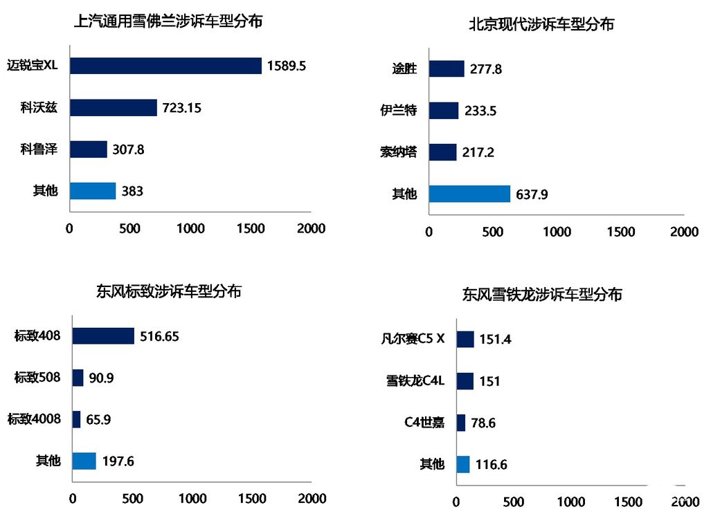 从车型分布来看,四个品牌投诉指数最高的车型都是各自的畅销车。相比之下,上汽通用雪佛兰、东风标致和东风雪铁龙的投诉多集中在某个或某几个车型,北京现代的投诉指数分布相对较为分散。