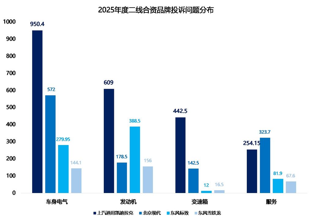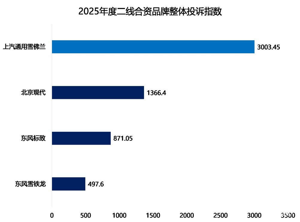 2025年度的投诉指数数据显示,上汽通用雪佛兰成了四个二线合资品牌中投诉指数最高的品牌,超过了北京现代、东风标致和东风雪铁龙之和。值得一提的是,这四个合资品牌中,上汽通用雪佛兰的投诉指数同比大幅上涨了76.6%。其他三个合资品牌投诉指数则不同幅度下降,东风标致和东风雪铁龙同比下降了两成以上。