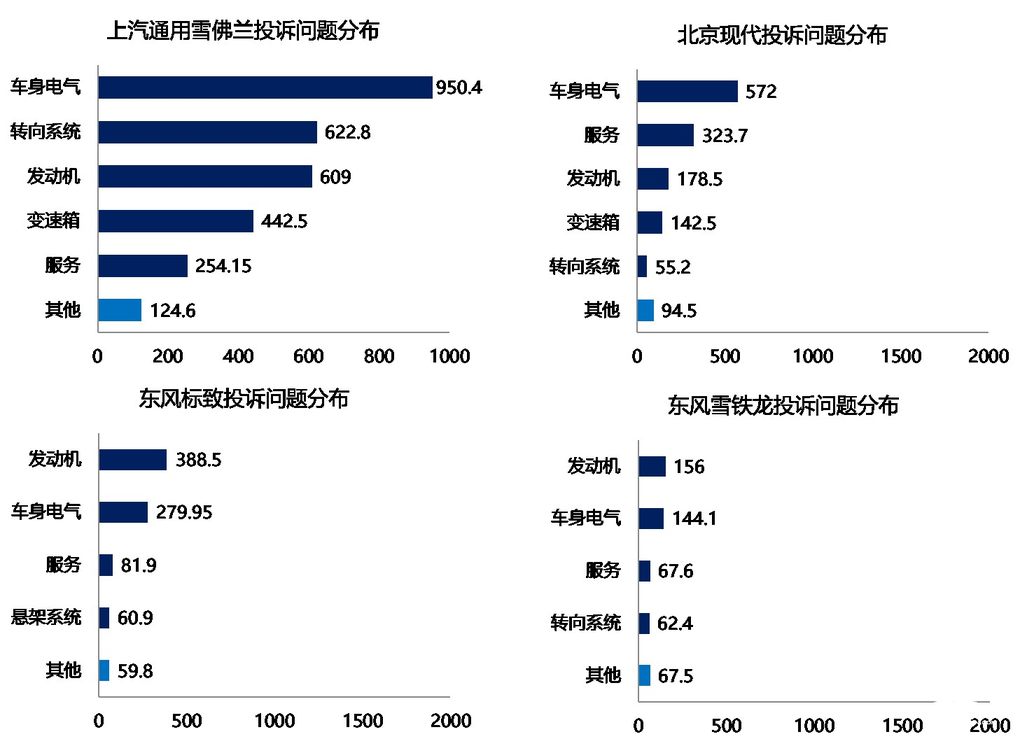 综合投诉数据来看,投诉指数最高的上汽通用雪佛兰车身电气、发动机和变速箱三大类问题的投诉均远高于其他三个合资车企。北京现代的服务类问题是四家投诉投诉最多,车身电气类问题也仅次于上汽通用雪佛兰。东风标致的发动机问题相对最为严重。