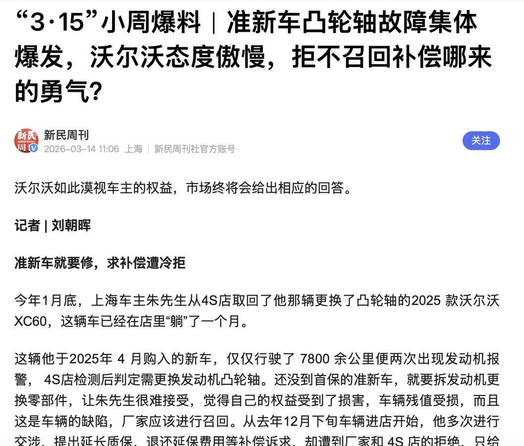 准新车凸轮轴故障集体爆发,沃尔沃拒赔拒退,傲慢态度寒了谁的心