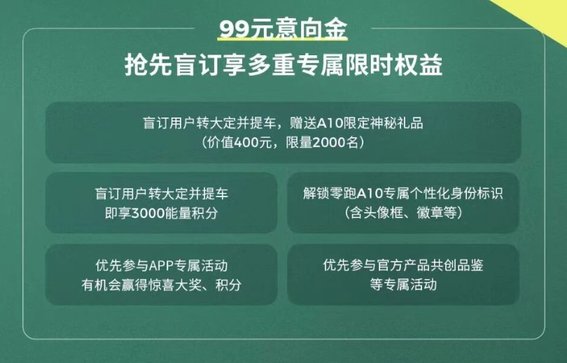 目前零跑A10已开启99元意向金盲订通道,盲订用户转大定并提车,可享多重专属限时权益: