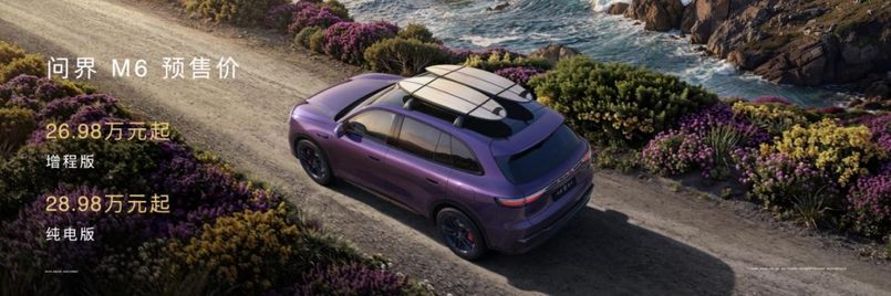 新锐智慧SUV问界M6在本次发布会正式开启预订,增程版预售价26.98万元起,纯电版预售价28.98万元起[14]。问界M6是满足Z时代年轻人实现自我表达,年轻品味的SUV,采用“大气场”的新锐美学设计,车身尺寸4960×1985×1736mm,轴距2950mm,正体态中大型SUV,每次出场都大气磅礴。搭载晶曜大灯,每次相视都大开眼界。整车采用空气动力学设计,使风阻系数降低至0.239cd[15],让每次出行都能大出风头。标配华为途灵平台,应急涉水深度可达700mm,每次跋涉都大步流星。