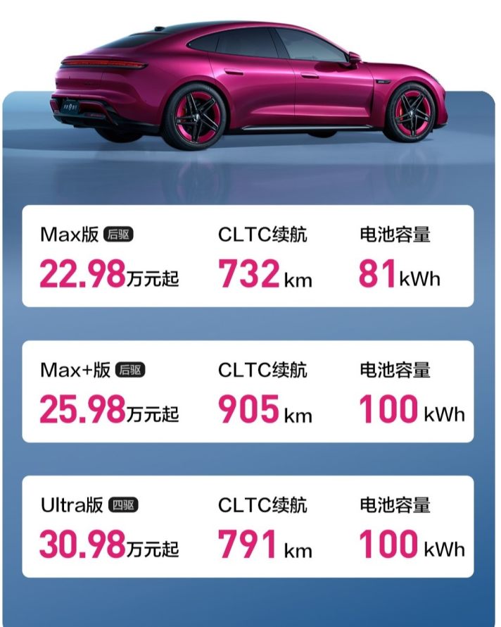 从25.98万元的Max+版升级到30.98万元的Ultra版,价格增加了5万元。这5万元带来的变化更大:首先是动力从单电机后驱升级到了双电机四驱,最大功率从264kW提升到434kW,百公里加速从5秒级提升到了3.44秒。