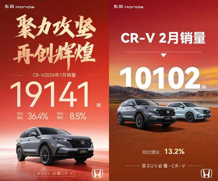 眼下15万元级仍然是SUV的“主战场”,在竞争愈发激烈的当下,当“降价增配”成为各家唯一的流量密码时,一组数据的出现显得格外“不合时宜”——东风本田CR-V在2026年1月销量达到19141辆,同比暴增36.4%、环比增长8.5%;2月再破万,同比增长13.2%。