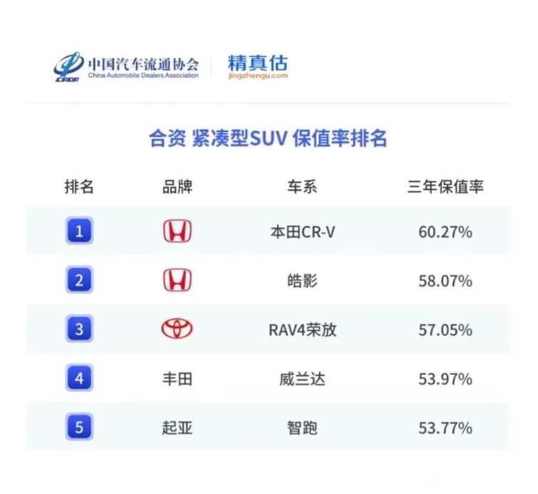 这种跨越两代人的信赖,在2026年初化作了最硬的通货——保值率。2026年1月,中国汽车流通协会公布的《2025年度中国汽车保值率报告》显示,CR-V以三年保值率60.27%的成绩,再次夺得合资品牌紧凑型SUV保值率冠军 。