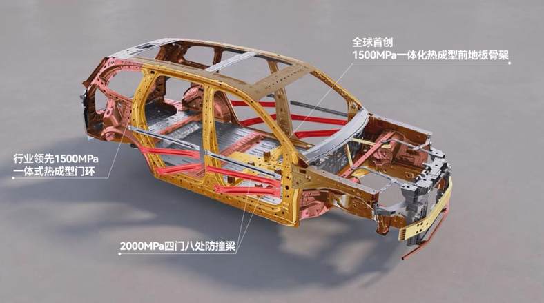 在车身材料及结构方面,华境S整车高强钢及铝合金占比超过85%,其中近30%为热成型超高强钢,为车身安全奠定了坚实基础。针对侧面撞击的薄弱环节,华境S采用了与宝钢共创的1500MPa一体式热成型前地板骨架,以及1500MPa一体式热成型门环,搭配十宫格结构的挤压铝门槛加强梁,同时在四门八处增设2000MPa车门防撞梁,堪比潜艇用钢,大幅提升了车身侧面的抗冲击能力,让侧面防护坚不可摧。在此超高强钢材质和一体式结构基础上,华境S进一步采用五纵十一横六环笼式车身结构,使车辆无论是在承受高速撞击的单点暴力冲击,还是在不规则跌落翻滚中的多维扭曲力时,都能确保车身框架的完整性与电池包的安全。