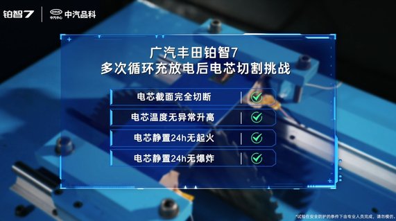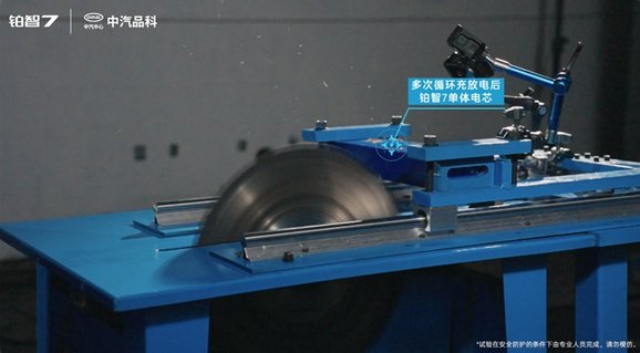 该测试分2轮进行,用于测试的2块单体电芯,均处于100%满电状态,其中一块为全新;另一块则经过了800多次循环充放电、等效行驶里程超30万公里。该测试为“全截面切割”,短路面积远超常规的针刺测试。测试结果显示,被切割的电芯温度无异常升高,静置24小时后无起火、无爆炸,这意味着,铂智7在最严重事故发生后,即使电芯受损,车辆也没有起火危险,确保乘员不受二次伤害;因救援需要而切割车辆时,同样不必担心切割触及电芯而引发火情。