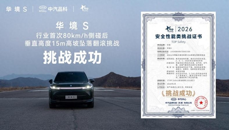 当高速侧撞与坠坡翻滚两大致命事故叠加,乘员能否安然无恙?2026年3月25日,上汽通用五菱与华为深化战略合作的首款旗舰——华境S,公布行业首次 “80km/h侧碰后垂直高度15m高坡坠落翻滚” 极限挑战成果,凭借硬核安全实力成功通关 “超纲大考”,斩获中汽品科 TOP Safety 安全性能证书,重新定义大六座 SUV 安全新标杆。