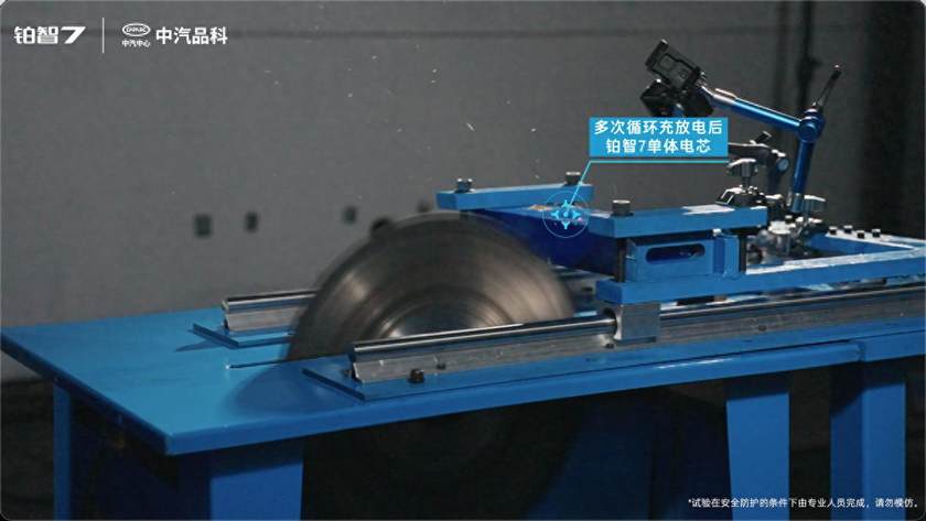 该测试分2轮进行,用于测试的2块单体电芯,均处于100%满电状态,其中一块为全新;另一块则经过了800多次循环充放电、等效行驶里程超30万公里。该测试为“全截面切割”,短路面积远超常规的针刺测试。测试结果显示,被切割的电芯温度无异常升高,静置24小时后无起火、无爆炸,这意味着,铂智7在最严重事故发生后,即使电芯受损,车辆也没有起火危险,确保乘员不受二次伤害;因救援需要而切割车辆时,同样不必担心切割触及电芯而引发火情。