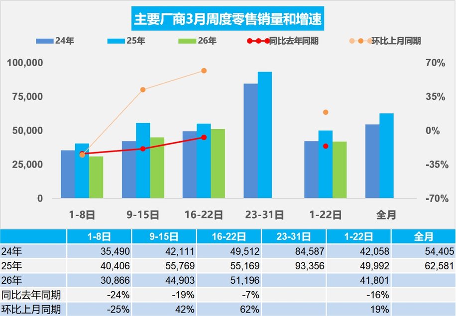 乘联会最新的数据显示,今年3月1日至22日,乘用车市场零售同比去年3月下滑了16%,仅比2月同期环比增加2%。而整个一季度新车销量大概下滑接近20%左右,新能源车下滑可能在25%左右。