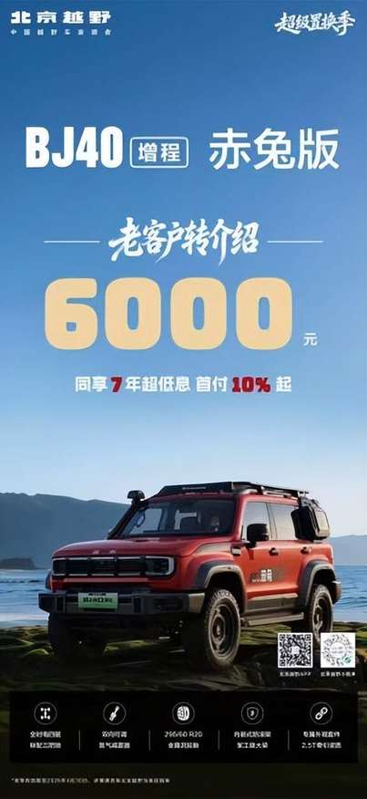 此外,北京越野还为BJ40增程赤兔版和BJ40探险家推出了专属优惠福利。北京越野老车主推荐购买BJ40增程赤兔版,可获得6000元奖励,这不仅是对老车主忠诚度的回馈,更将“省钱”的机会从购车者延伸到了推荐者身上;BJ40探险家限时优惠10000元,起售价13.99万元。直降优惠让这款车型以更具竞争力的价格进入更多消费者的视野,省了多少一目了然。