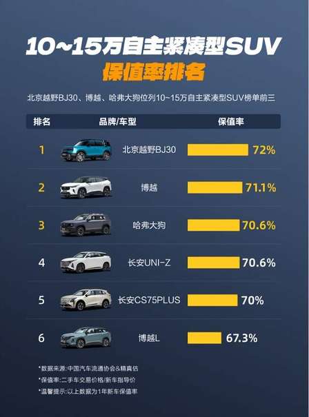 保值率方面,北京越野更是遥遥领先,根据中国国际贸易促进委员会汽车行业分会汽车金融暨保值率研究委员会发布的“硬派越野非承载式SUV保值率排名”榜单,北京越野BJ40以50.28%的3年保值率强势登顶,进一步印证了其在产品力、用户口碑与长期价值层面的全面领先。根据中国汽车流通协会和精真估联合发布的《2026年2月中国汽车保值率研究报告》显示,北京越野BJ30在10-15万自主紧凑型SUV市场以72%的保值率位居榜首。