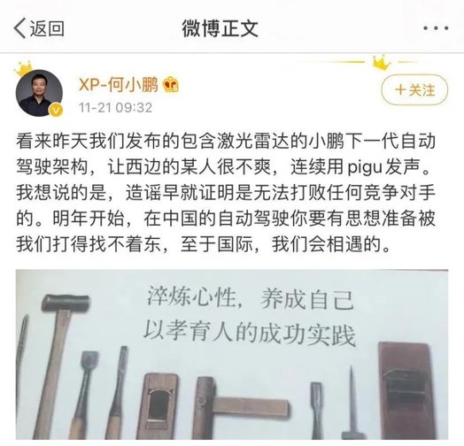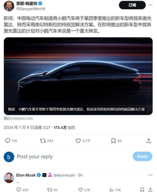 而小鹏早期是激光雷达的坚实拥趸。2020年11月份,小鹏宣布将在2021年量产车型上搭载激光雷达,马斯克在推特上嘲讽:“他们有特斯拉的旧版软件,却没有我们最新的神经网络计算机。”