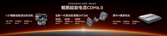 • 超高效能: 搭载鲲鹏超能电混CDM6.0系统,1.5T混动专用发动机热效率高达45.79%,配合DHT260超混变速箱,机械效率达98.5%。四驱版零百加速仅5秒级,动力响应迅猛;CLTC纯电续航230km,日常通勤一周一充无压力;馈电油耗低至3.9L/100km,CLTC综合续航突破2000km,满油满电轻松支撑跨省长途出行,彻底消除续航焦虑。800V高压快充加持下,充电10分钟可补充约300km续航,补能效率拉满。