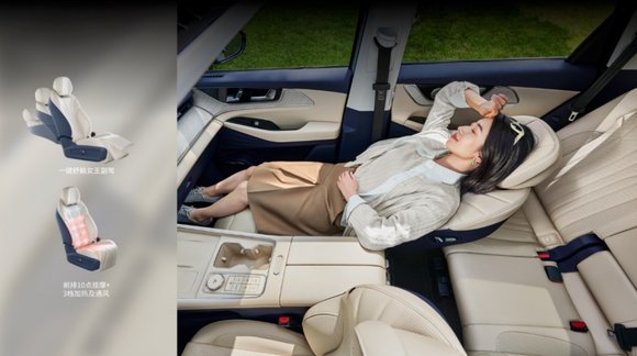 • 越级空间: 2920mm超长轴距打造2米级座舱空间,二排腿部空间达1037mm,二排儿童活动空间达2.6㎡,远超同级。后备箱常规容积573L,放倒后拓展至1597L,满足露营装备、婴儿车等家庭储物需求。前排双零重力座椅支持16向电动调节,集通风、加热、按摩、记忆功能于一体,二排座椅支持35°电动调节,搭配通风和加热,全家出行均能享受舒适坐姿。同级唯一的前排+后排双大床模式,进一步提升空间灵活性。