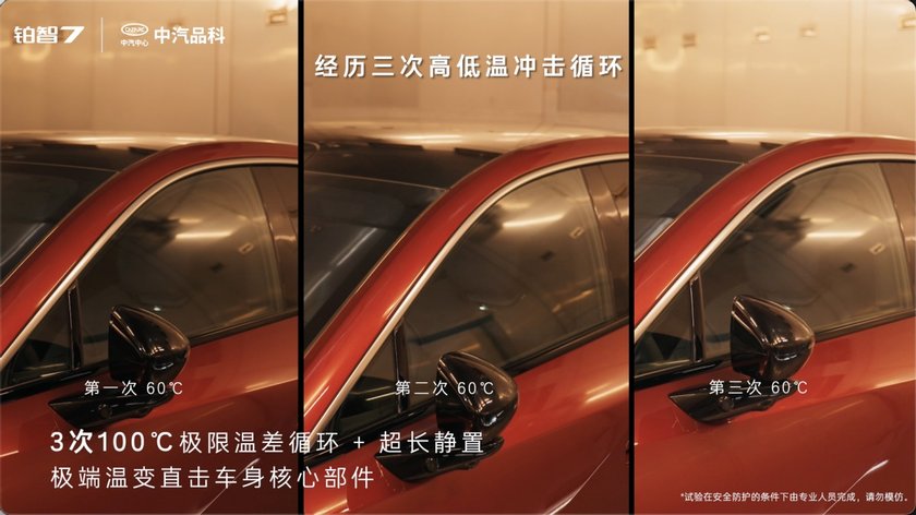 “整车极寒极热循环冲击”覆盖-40℃到60℃的极限温差,相当于从寒冬腊月的内蒙古牙克石,到七八月份的新疆吐鲁番。3轮急剧、宽幅的温度变化对车辆的电子电气系统、密封件、内饰材料等都构成严峻考验。测试后,车辆外观无变形、车机功能操作全部正常。意味着中国境内任意气温环境变化都不会对车辆造成损坏。