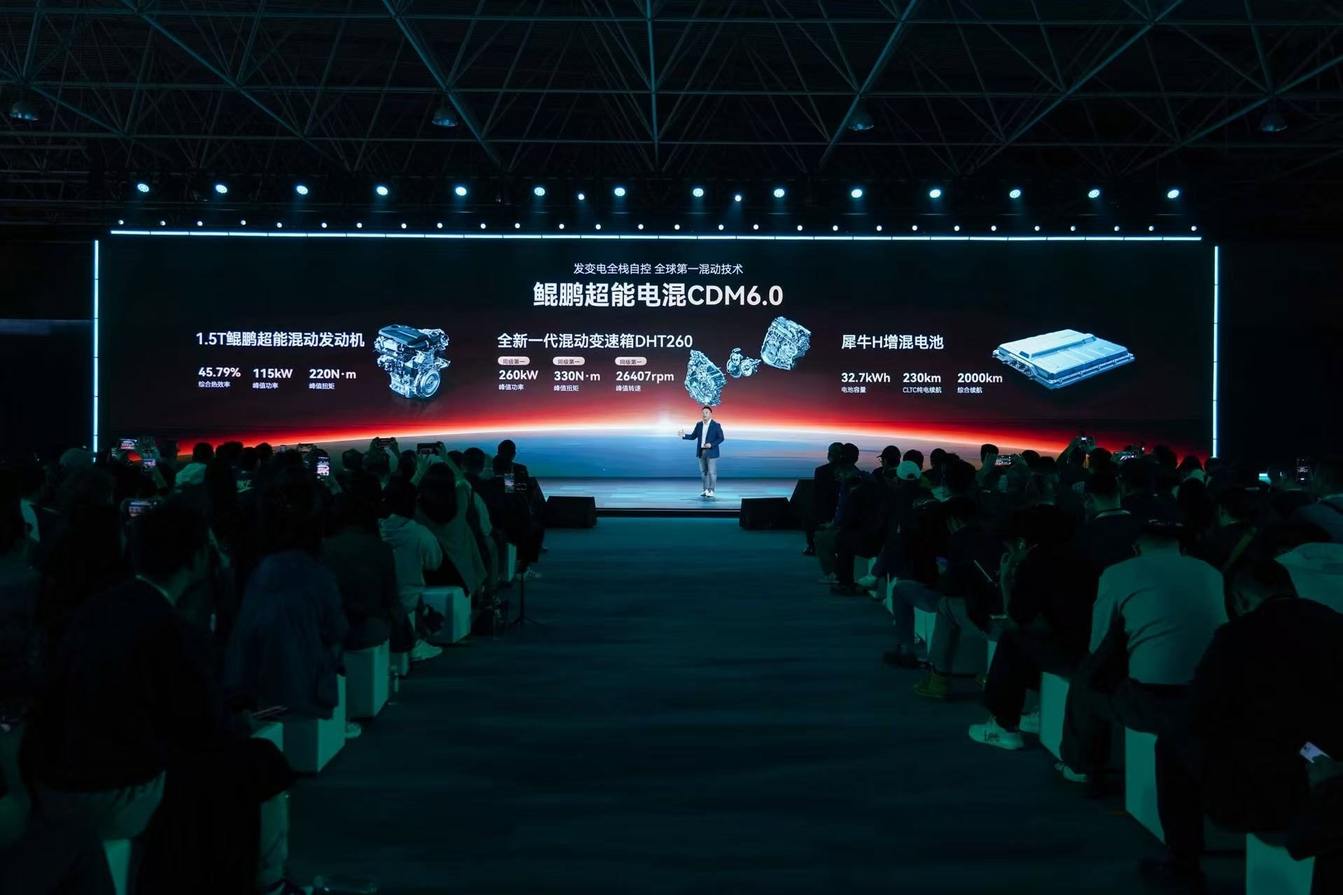动力部分,新车搭载鲲鹏超能电混C-DM 6.0系统,CLTC综合续航突破2000km,CLTC馈电油耗低至3.9L/100km,零百加速为5秒级。该混动系统热效率达到45.79%,处于行业前列。