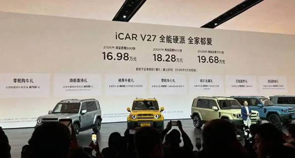 iCAR V27:16.98万起,入门即四驱,顶配19.68万,性价比拉满。主打家庭新硬派,适合预算17-20万、追求低门槛的年轻家庭与科技发烧友。