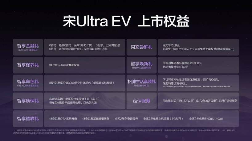 比亚迪王朝正在构建一个从购车、用车、到养车的全链路无忧体系。为此,宋Ultra EV带来了“0元购、0元用、0元养”的超重磅购车权益!同时还有其他丰富权益,为用户带来超值购车体验。