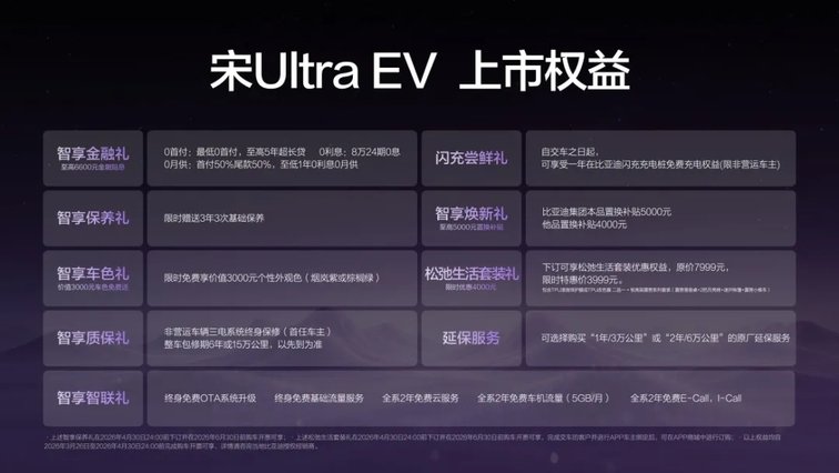 购车权益方面,宋Ultra EV推出“0元购、0元用、0元养”政策,预售期间订车用户可享受18个月免费闪充权益。该车型定价15.19万-17.99万元,面向家庭用户及注重出行便捷性的纯电消费者。