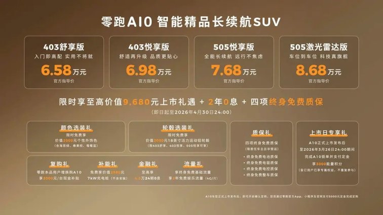 3月26日,零跑A10正式完成上市,新车售价为6.58-8.68万元。新车定位是时尚A0级SUV车型,将会采用家族化的设计语言,并且融合了更过年轻元素在其中,还将搭载激光雷达,支持城区领航、高快领航、车位到车位领航以及全场景的辅助泊车。