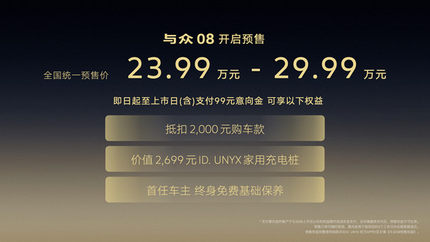 为回馈用户期待,与众08推出限时预售权益:用户支付99元意向金,即可抵扣2000元购车款,首任车主可享终身免费基础保养,同时获赠价值2699元的ID. UNYX家用充电桩。目前,新车已陆续进驻金标大众门店,消费者可到店预约试驾,近距离感受旗舰实力。