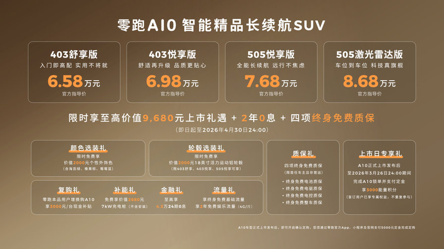 3月26日,零跑A10正式上市,售价6.58万-8.68万元,给10万内纯电市场投下了一颗“重磅炸弹”。新车是零跑全新A平台的首款车型,用激光雷达下探、全域空间优化、双旗舰芯片加持等操作,打破了低价纯电必减配的行业潜规则。