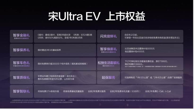 比亚迪王朝正在构建一个从购车、用车到养车的全链路无忧体系。为此,宋Ultra EV带来了“0元购、0元用、0元养”的超重磅购车权益!同时还有其他丰富权益。