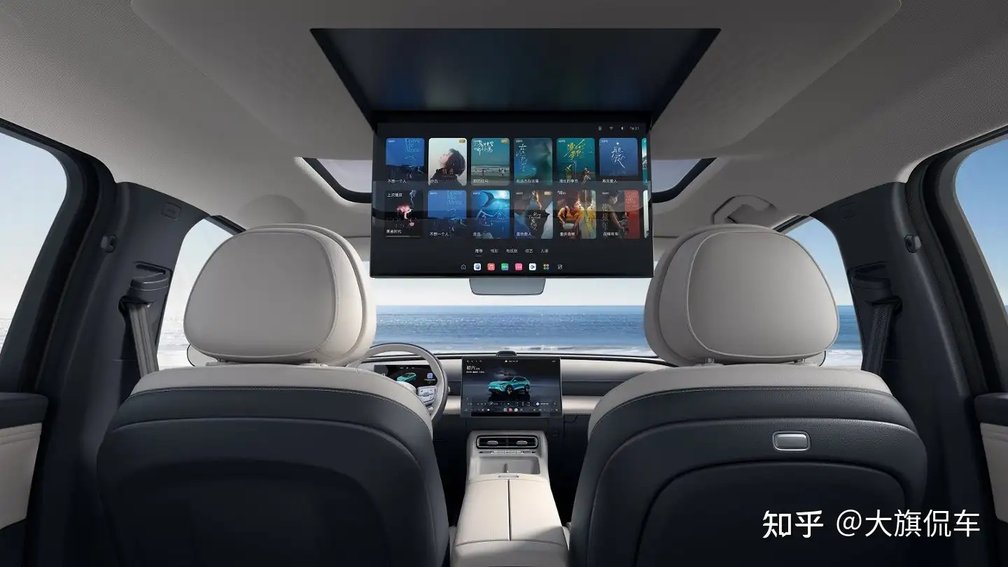 更主要的是,不仅后排空间够大,后排还配有吸顶屏,并且尺寸同样“够大”;除此之外,后排还配有一块功能操作屏,再配合上前排悬浮式车机大屏,娱乐属性也同样拉满。