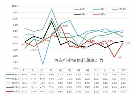 电视行业的困境并非个例,国内汽车市场同样步入存量饱和的关键阶段。乘联会数据显示,2025年国内狭义乘用车累计销量达2374.4万辆,市场规模保持稳定,但行业销售利润率仅4.1%,远低于工业整体5.6%的均值,薄利甚至亏损成为不少车企的生存常态。