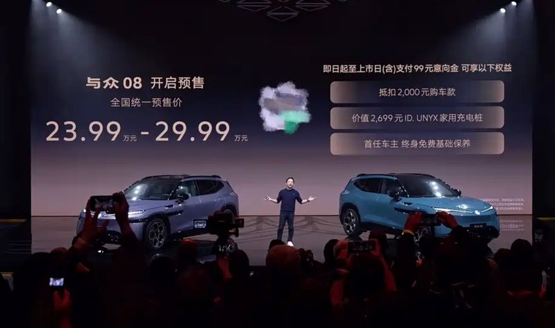 与众08定位高端家用大五座纯电SUV,预售价:23.99万元-29.99万元。
