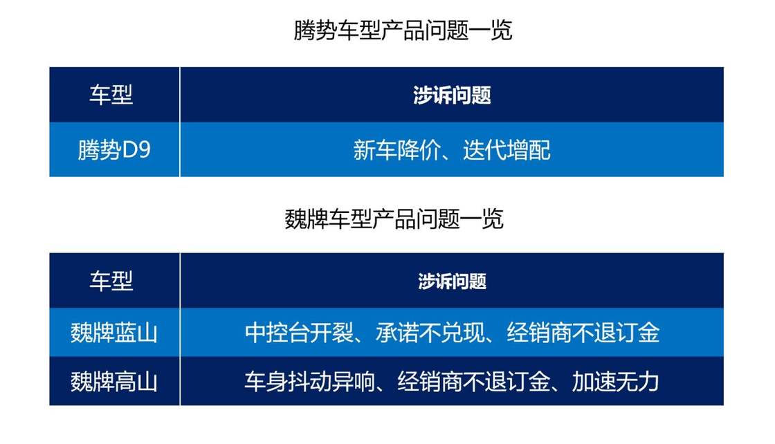 从涉诉车型的具体投诉问题来看,腾势D9与魏牌蓝山、高山呈现出明显不同的矛盾核心。其中,腾势D9的投诉集中在市场与产品策略层面,主要由新车定价波动、产品迭代节奏过快引发用户情绪不满,核心争议偏向消费预期与品牌沟通层面的问题。而魏牌蓝山、高山的投诉则聚焦产品质量与终端服务履约层面,既包含车辆本身的可靠性缺陷,也暴露出经销商管理、销售承诺兑现不足等体系性问题。