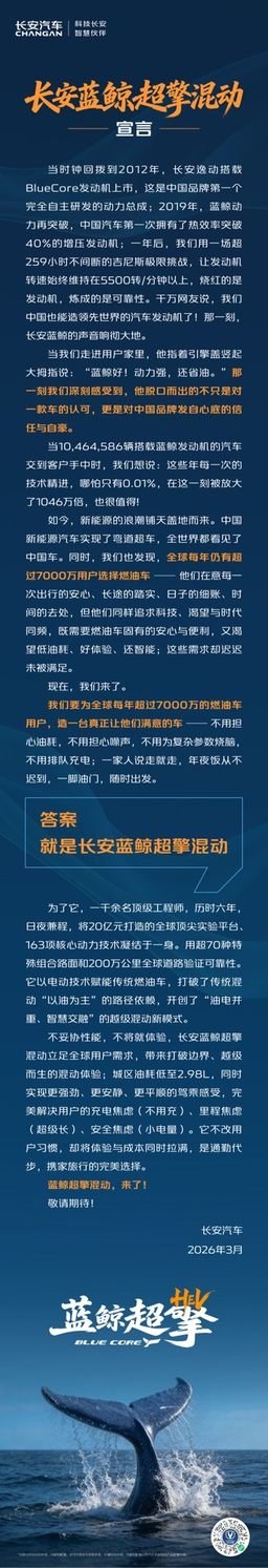 其中,长安汽车3月12日发布《长安蓝鲸超擎混动宣言》,明确提出以电动技术赋能传统燃油车,打破传统混动“以油为主”的路径依赖,开创了“油电并重、智慧交融”的越级混动新模式。