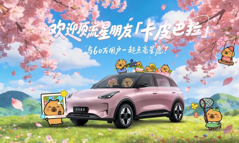 同时,为了贴近用户对松弛感、治愈感生活方式的追求,吉利星愿正式官宣与顶流“星”朋友卡皮巴拉小黄豚跨界联动,为60万老车主带来丰厚福利,车主可通过银河APP抽取卡皮巴拉盲盒和相关福利。