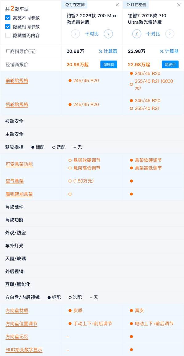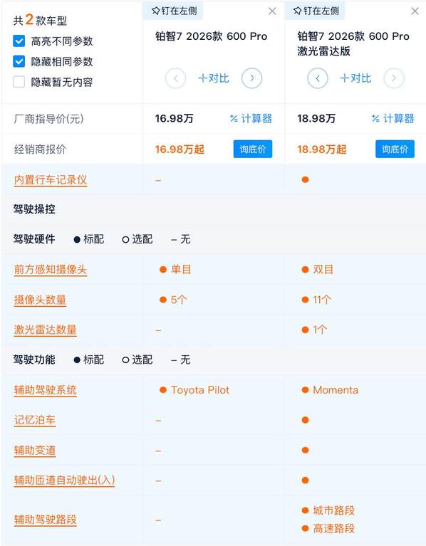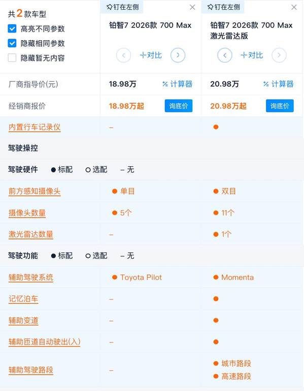 价格上看,铂智7的700km版本一共有2款,分别是700 Max售价18.98万,700 Max激光雷达版售价20.98万,差价也是2万元。