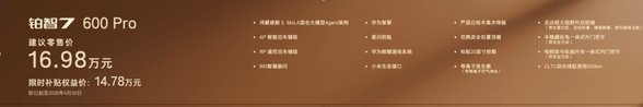 铂智7秉持“D级车享B级价”理念,入门即豪华、高配即满配、顶配更奢华,核心功能全系标配,同时按用户需求划分配置梯度,诚意拉满。600Pro版限时补贴权益价14.78万,作为同价位最大尺寸旗舰轿车,标配内置MoLA架构的鸿蒙座舱5,具备类人化智能交互,还搭载带智能泊车的L2级智驾、华为智擎、尊界同款星闪钥匙、纯天然实木内饰、座椅通风加热、20寸轮毂等超15项豪华配置,依托丰田全球品质,性价比遥遥领先。