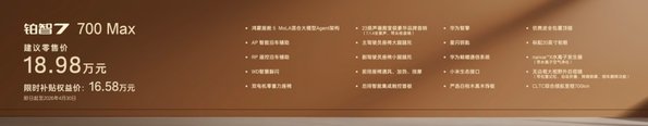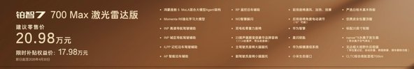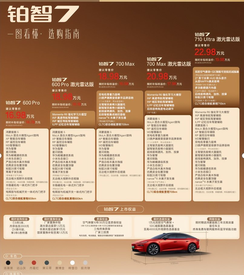 700km续航版本共推出3款车型,均标配双电机零重力座椅、主驾大腿托、后排智能触控面板和23扬声器等超11项配置,将过往30万以上车型的豪华舒适配置,全部下放到20万以内。其中700Max版限时补贴权益价16.58万,加5000元即可选装行业最低价双腔空悬,成为17万级双腔空悬纯电家轿首选;700Max激光雷达版限时补贴权益价17.48万,新增Momenta R6大模型高阶智驾辅助,再加5000元选装基金,即可升级为700Max激光雷达双腔空悬版,一次性配齐华为鸿蒙座舱5、Momenta R6大模型激光雷达智驾、双腔空悬超豪华三件套,为20万内唯一该配置车型。