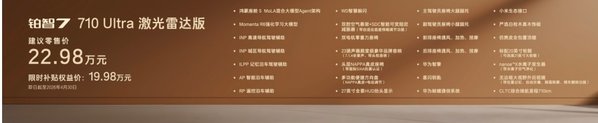 顶配710 Ultra激光雷达版限时补贴权益价19.98万,集齐鸿蒙座舱、激光雷达智驾、双腔空悬、零重力座椅、23扬声器等全部豪华配置,实现豪华一步到位,同时配备27英寸全景HUD抬头显示、NAPPA真皮方向盘和座椅、智能香氛系统等情绪价值配置,是同价位最具性价比的选择。