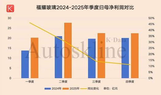 2025年第四季度,福耀玻璃净利润不仅环比下降0.47%,且同比增速从第一季度的46.25%递减至11.35%。
