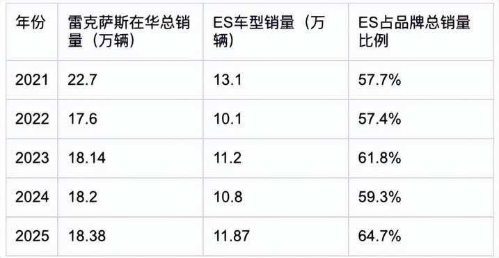 2021-2025年雷克萨斯中国总销量&ES销量占比