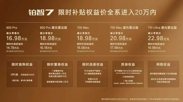 比如,限时权益价仅为14.78万元的600km Pro版上,铂智7标配了鸿蒙座舱5,内置MoLA架构,具备类人化智能交互;同时搭载带智能泊车的L2级智驾,以及华为电驱、尊界同款星闪钥匙、纯天然实木内饰、座椅通风加热、20寸轮毂等超15项豪华配置。