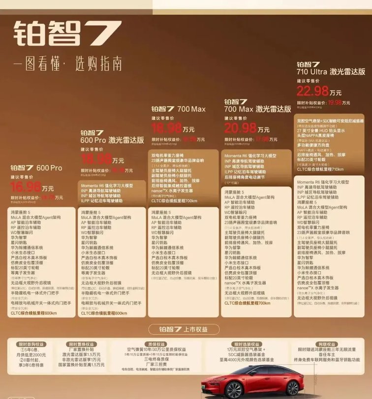 再说选装。很多用户想要激光雷达智驾,但又不想为“期货”功能买单。铂智7的做法是:在600 Pro和700 Pro版基础上,仅需增加约1.5万元,就能升级到激光雷达版,一步解锁Momenta高阶智驾。而且,交付即享全量功能,终身免费——没有后续订阅的套路,没有“以后OTA再说”的敷衍。