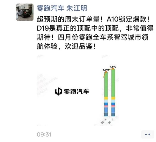 《车尚时刻》新媒体获悉,3月30日,零跑汽车创始人、董事长兼CEO朱江明在社交平台发出最新销量战报:超预期的周末订单量!A10锁定爆款!D19是真正顶配中的顶配,非常值得期待!四月份零跑全车系智驾城市领航体验,欢迎品鉴!战报显示,零跑周六大定订单达4394台,周日持续高热,维持在4692台高位,共超9000+台。 在3月底,零跑以强势表现,率先引领电车市场复苏,得益于ABCD全系列的协同爆发,印证了“全域自研”与“好而不贵”品牌主张已深入用户心智。